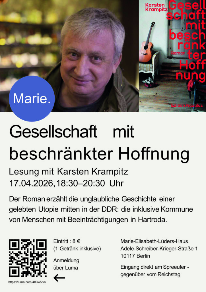 Das Buch „Gesellschaft mit beschränkter Hoffnung“ von Karsten Krampitz spielt Ende der 70er Jahre in der DDR. In einem Heim für behinderte Jugendliche beschließen vier Freunde, die sich kaum bewegen können: Wir brechen aus. Von Rente und Pflegegeld wollen sie sich Pfleger finanzieren, ein Haus bekommen sie von der Kirche – das alte Pfarrhaus in Hartroda im Altenburger Land.